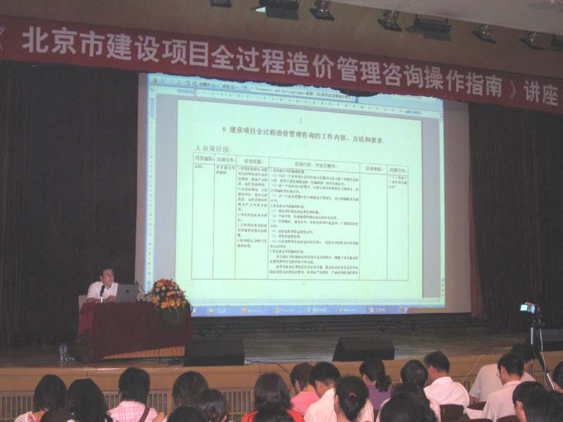 為更好的貫徹落實《指南》的執(zhí)行,2007年8月8日,由北京市建設(shè)工程造價管理協(xié)會組織,在中國建筑科學(xué)研究院禮堂舉辦了《北京市建設(shè)項目全過程造價管理咨詢操作指南》講座,對全市三百多家工程造價咨詢企業(yè)進(jìn)行《指南》的宣貫,由公司董事長周和生對《指南》的操作作了全面的介紹和重點的講解。